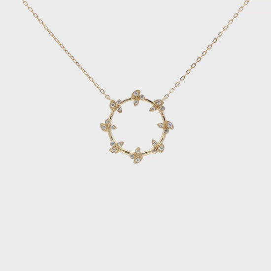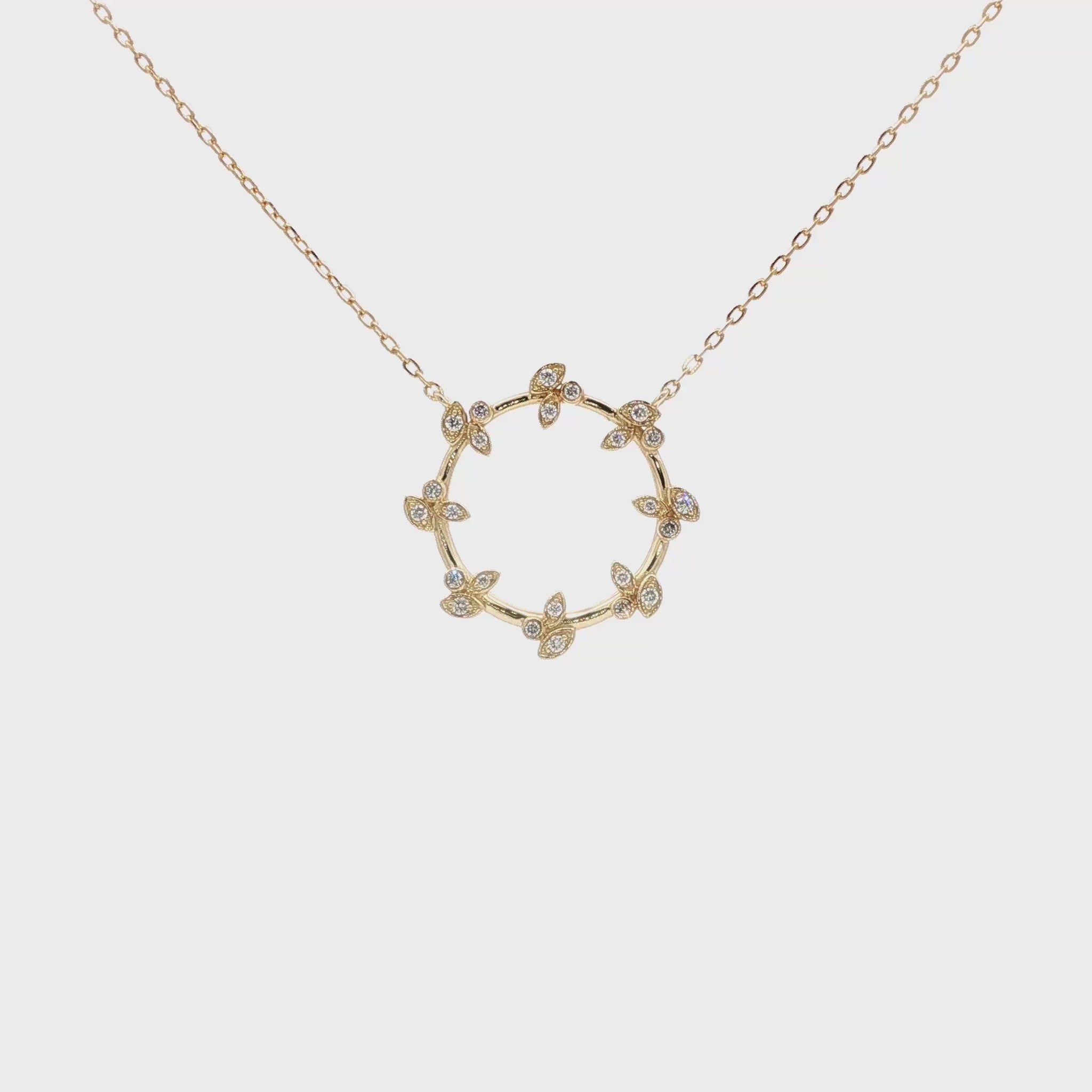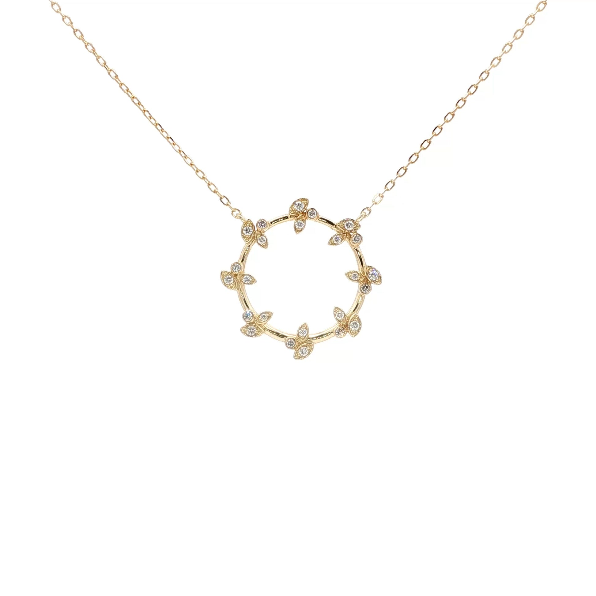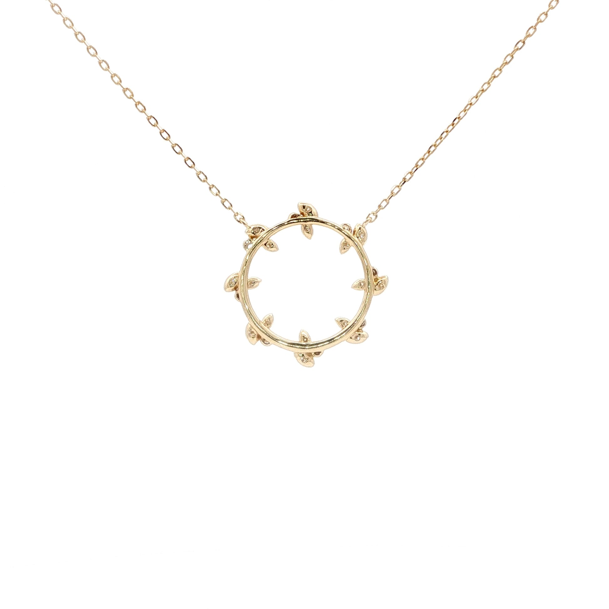 Elegant and symbolic, this Olive Leaf Circle Pendant represents peace, unity, and everlasting grace. Crafted in 18kt yellow gold, the circular design is accented with round brilliant diamonds totaling .17 carats, delicately set along the olive leaf motif. The pendant’s polished finish and balanced form make it a timeless statement of natural beauty.